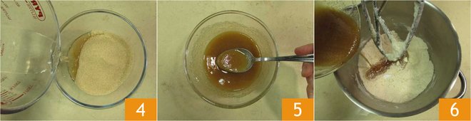 Meanwhile, pour the brown sugar and room temperature water into a separate bowl 4 and mix well 5. Add the water and sugar mixture to the dough 6 and start the stand mixer again.