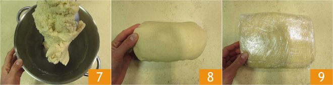 You should obtain a smooth, homogeneous, and compact dough 7. At this point, transfer the dough onto the work surface and form a loaf 8, cover with plastic wrap 9 and let it rest in the refrigerator for at least 30 minutes before using it. Your eggless shortcrust pastry is ready!