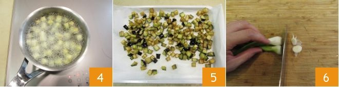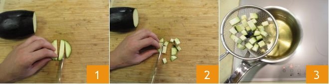 To prepare the eggplant and cherry tomato frittata, first wash the eggplants, trim them, and cut them first into slices and then into cubes about 0.4 inches thick (1-2). Heat plenty of oil and bring it to a temperature of 340°F. When hot, immerse the eggplants little by little 23,