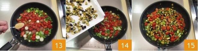 add the spring onions 10 and the cherry tomatoes 11. Salt and pepper 12