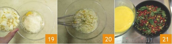 and the caciocavallo 19. Whisk everything together 20 and pour into the pan 21.