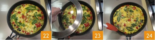 Wait a few seconds 22, then cover with a lid 23 and let cook for about ten minutes over medium-low heat. After the 10 minutes, using a spatula, detach the edges of the frittata from the pan 24