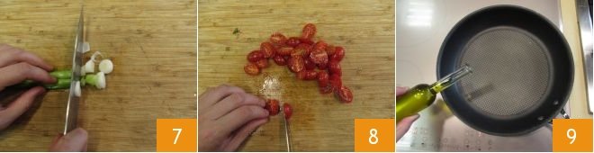 and cut it into rings 7. Then cut the cherry tomatoes in half 8. Heat a drizzle of oil in a pan 9