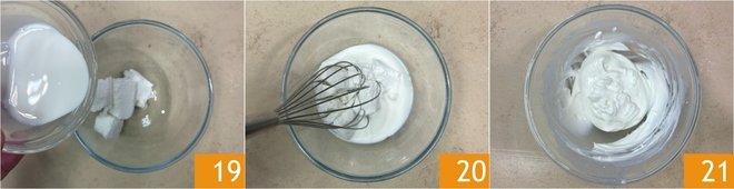 In a bowl, put the goat cheese and add the milk 19, mix with a hand whisk 20 until you get a fairly fluid cream 21. If it turns out too thick, you can add more milk.