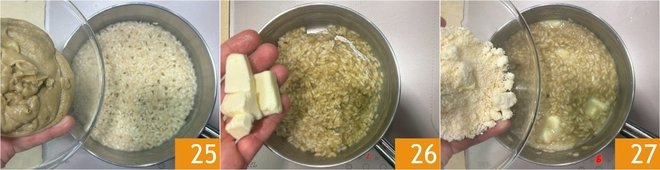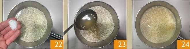 Toast the carnaroli rice dry with salt 22, then add the vegetable broth 23 and cook 24.