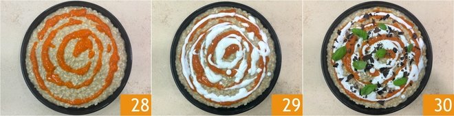 Plate and dress with the tomato cream 28 and the goat cheese cream 29. Finish with crumbled eggplant skin and a few basil leaves 30. The eggplant and cherry tomato risotto is ready to be served.