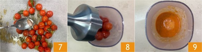 Remove the garlic 7, take the tomatoes and blend them 8 until you get a smooth and homogeneous sauce 9. Put the eggplant back in the oven and let it bake under the same conditions for another 10 minutes or until it becomes soft.