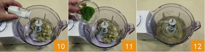 Season with salt 10 and also add the mint leaves 11, then blend until you get a thick and homogeneous puree 12.