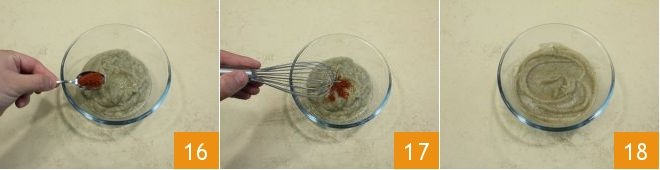 Finally, add the paprika 16 and mix with whisks to blend the ingredients well 17: your eggplant caviar is ready to be served 18, accompanied by fresh vegetables or spread on crunchy crostini.