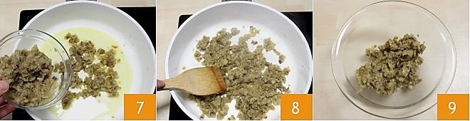 In a pan, heat a drizzle of oil and a clove of garlic; as soon as the garlic is golden, add the chopped eggplant pulp 7 and sauté for about 10 minutes over high heat, stirring occasionally 8. When the eggplants are ready, transfer them to a bowl and set them aside to cool slightly 9. Set aside the pan you used to sauté the eggplants.