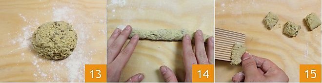 When the ingredients are combined, form a ball with the mixture obtained and transfer it to a floured work surface 13. Then, start making the gnocchi: roll the dough with your hands to create ropes about 1 inch thick 14; cut your gnocchi about 1 inch on each side. To give the gnocchi a more defined shape, create the characteristic ridges by sliding each gnocchi on a wooden gnocchi board 18 or passing them over the prongs of a fork.