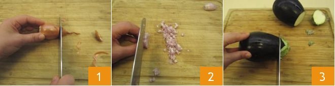 To prepare the eggplant risotto, start by preparing the Vegetable broth to use hot. Alternatively, you can use water, but the risotto will be tastier with vegetable broth. Then proceed with preparing the sauté: peel the shallot 1, chop it with a knife 2, and set it aside for a moment. It's time for the eggplants: after washing them, remove the ends 3
