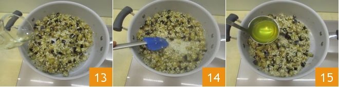 stir 10, and cook them for about 4 minutes, still on low heat. Then add the rice 11, stirring well to toast it along with the eggplants 12.