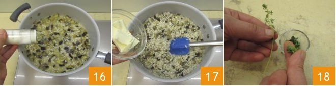 When the rice is cooked, add a pinch of salt 16: be careful not to add too much, as the broth is already salty. Now you can turn off the heat and add the butter 17, letting it cream for a few minutes while stirring. In the meantime, strip the thyme sprigs 18