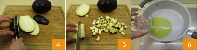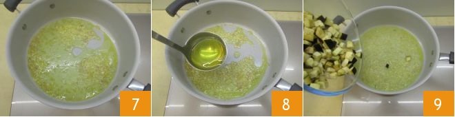 Sauté the shallot over low heat for 4-5 minutes, 7 stirring occasionally to prevent sticking. Then deglaze with a ladle of boiling broth 8 and let your sauté cook for another 10 minutes. After this time, add the diced eggplants 9