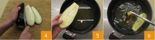 Then cut them into slices also about 0.12–0.16 inches thick 4. Heat a pan with plenty of seed oil for frying, bringing it to a temperature of 284°F. Then immerse a couple of slices of eggplant at a time 5 and cook on both sides for a total of 1-2 minutes 6.