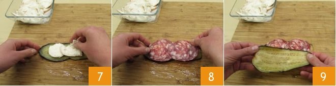 Drain the eggplant slices, dry them with some kitchen paper and place them on the cutting board, then add the slices of provola 7 and salami 8. Then close with another slice of eggplant and continue like this with all the others 9.
