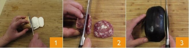 To prepare the eggplants a pullastiello, start by washing and drying the eggplants. Then move to the cutting board and slice the smoked provola (or mozzarella) into slices about 0.12–0.16 inches thick. Then cut the Neapolitan salami, after removing the casing, into slices about 0.04–0.08 inches thick 2. Move on to the eggplants: remove the two ends and the first two slices of the opposite sides 3.