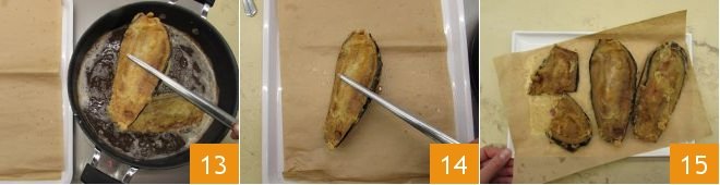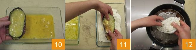 Break the eggs into a shallow and wide bowl, season with salt and pepper. Dip the stuffed eggplants first in the eggs 10 and then in the flour 11. Make sure the flour adheres well so that everything is compact and sealed within the egg and flour wrapper. Dip a couple of pieces at a time into the boiling oil at 284°F 12,