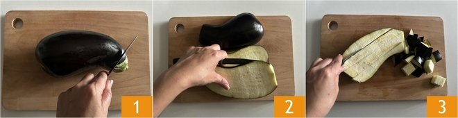 To prepare the eggplants in the air fryer, start by washing the eggplants. Then place them on a cutting board and remove the ends 1. Slice the eggplants 2, then cut them into sticks, and finally start cutting into cubes of about 0.4 inches 3.