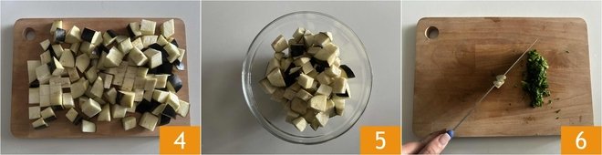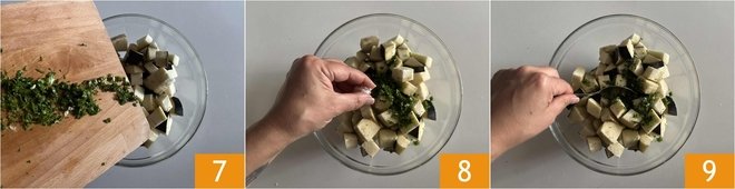 Once you have your cubes 4, transfer them into a bowl 5. Finely chop basil, parsley, and garlic 6.