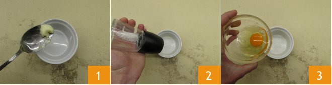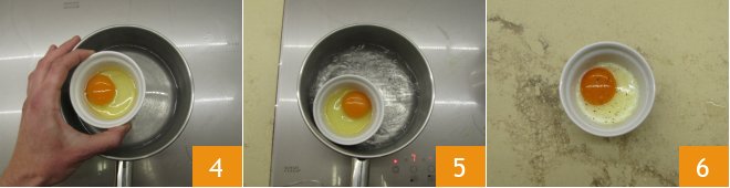 To prepare the eggs en cocotte, start by buttering a cocotte with a diameter of 3.5 inches 1. Salt 2 and pour in the room-temperature eggs, one at a time, previously cracked into a bowl or a saucer 3.