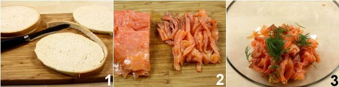 To prepare eggs en cocotte with smoked salmon, start by removing the crust from the bread slices with a knife, 1 lightly brush them with extra virgin olive oil and place them in the oven to grill, using the grill setting for a few minutes, turning them during cooking. Meanwhile, cut the smoked salmon into thin strips 2 and put it in a bowl, add the sprigs of dill 3