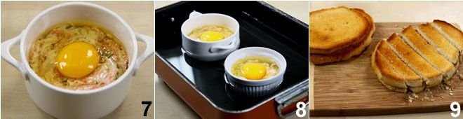 Place an egg (being careful not to break it) on top of each cocotte 7. At this point, fill a baking dish with boiling water halfway, place the cocottes inside 8 and bake at 356°F (180°C) for 15 minutes. Garnish with ground pepper, dill leaves, and serve the eggs en cocotte with salmon accompanied by the grilled bread slices cut into strips 9.
