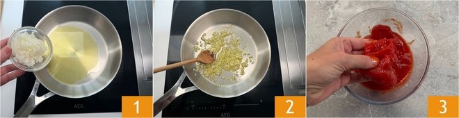 To prepare the eggs in purgatory, first pour a swirl of oil and a finely chopped onion into a pan 1. Let it gently sauté for 8 to 10 minutes until it becomes soft and translucent 2. Meanwhile, crush the peeled tomatoes with your hands 3.