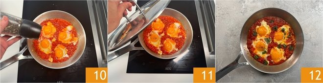 Season with a pinch of salt and pepper 10, cover again 11 and, still at a gentle temperature, cook for another 4 to 5 minutes. Check the eggs to ensure the cooking does not exceed your desired level and that the yolk remains soft. Finish with hand-torn basil 12. Serve your eggs in purgatory with bread for dunking!