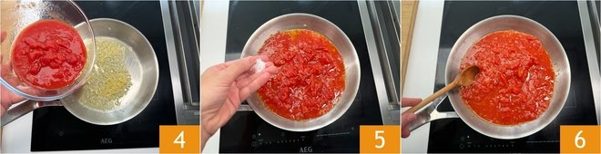 When the onion is ready, add the peeled tomatoes to the pan 4, then salt 5 and mix 6.