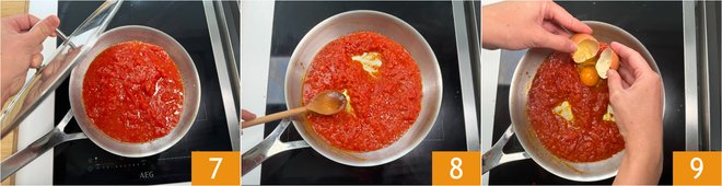 Cover with a lid 7 and let it cook on low heat for 20 minutes, stirring occasionally. Remove the lid, make as many wells in the sauce as there are eggs you want to add, in this case 4; use a spoon or wooden ladle to make the wells 8 and break the eggs into them 9. For convenience, you can also crack them into a small bowl first and then let them slide into the pan.