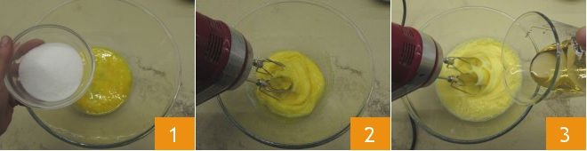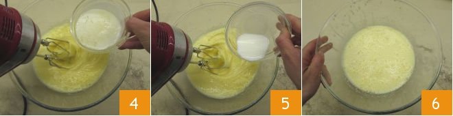 Continue beating with the beaters and also incorporate the melted butter at room temperature 4 and the milk 5. Keep beating with the beaters until you obtain a homogeneous mixture 6.