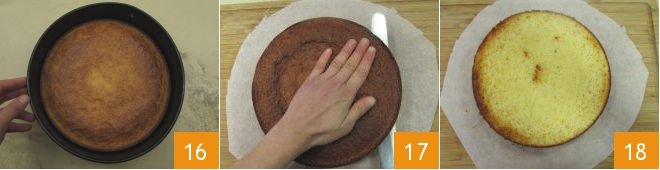 Meanwhile, the cake will have finished baking; take it out of the oven 16 and let it cool. Once the cake is cold, remove it from the pan, level it 17 by cutting off the excess dome with a serrated knife 18.
