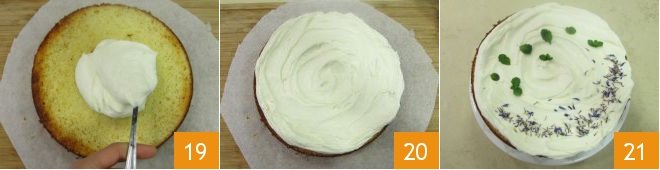 Spread the frosting with the back of a spoon 19, you should cover the entire surface 20. Decorate with mint leaves and lavender flowers 21 and let it rest in the fridge for at least twenty minutes before serving the elderflower cake with cream cheese frosting.