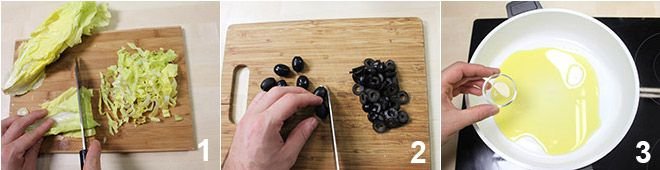 To prepare the escarole fritters, clean, wash, and julienne the escarole lettuce 1, then slice the black olives into thin rounds 2. In a non-stick pan, brown 2 cloves of garlic with a little oil over low heat 3, and,
