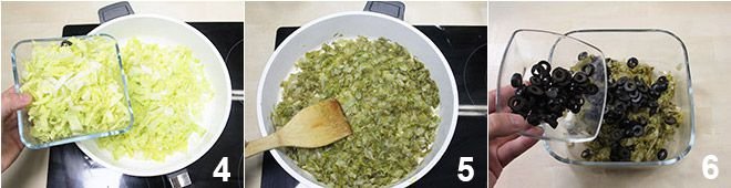 when it has turned golden, remove it and add the escarole 4. Cook it over medium heat for 15-20 minutes, or until all its water has evaporated: the escarole should become almost browned 5; once cooked, turn off the heat and place it in a bowl along with the olives 6,