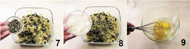 the capers 7, and Parmesan cheese 8. Mix all the ingredients well and start preparing the batter: beat the eggs 9