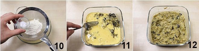 together with the baking soda and flour, sifted together 10, then add the mixture to the escarole and mix well (11-12).