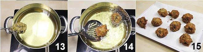 In a pan, heat the vegetable oil, and when it has reached a temperature of 356°F, start frying 13. If you don't have a kitchen thermometer, to check the oil temperature, take a teaspoon of batter and drop it into the oil: if it floats and starts to fry, the temperature is correct. Using a spoon, form balls of batter, which you will drop into the oil and cook for a maximum of two minutes. Drain the escarole fritters with a slotted spoon 14 and place them on a tray covered with absorbent paper to remove excess oil, then let them cool slightly and serve.