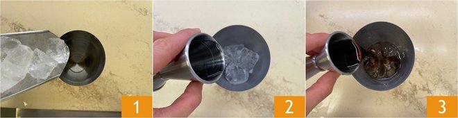 To prepare the Espresso Martini, pour the ice into the shaker 1, then add the vodka 2 and the Kahlúa 3.