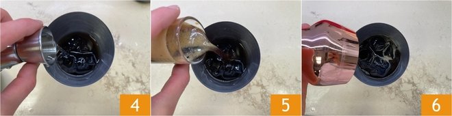 Add also the sugar syrup 4 and the espresso coffee 5. Close the shaker with the lid and shake well 6.
