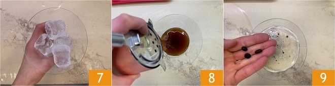 Chill 2 cocktail glasses with ice 7 and then remove it. Using a strainer, divide the drink into the glasses 8, decorate with coffee beans 9, and serve your Espresso Martini immediately!