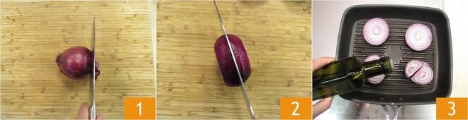 To prepare the fake carbonara, start with the onions. Peel them 1 and cut them in half 2. Place the onions on a grill, adding a drizzle of oil on top 3.