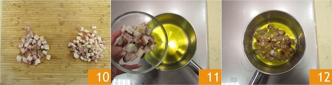 While the other 80 g, cut them into smaller cubes 10. Now pour some oil into a small pan, heat it, and add the larger cubes of guanciale 11. Let it simmer gently 12 until it is well-flavored but still soft. Then let it cool in the oil.