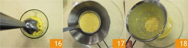 Blend with an immersion blender 16 and transfer the mixture into a fine-mesh sieve placed over a bowl 17. Strain it to obtain a smooth cream 18.