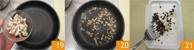 Now place the guanciale cut into small cubes in a hot pan 19. Let it toast 20 until it becomes crispy. Then transfer it to a small tray with paper towels and let it rest 21.