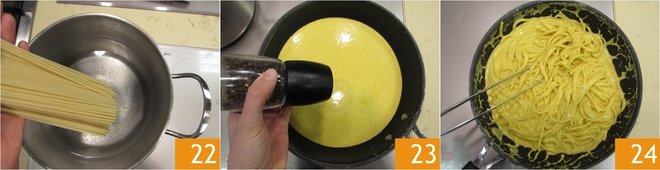 Now it's time to cook the pasta in boiling, salted water to taste 22. Pour the sauce obtained into a pan, adjust with salt and pepper 23. Heat it and as soon as the pasta is al dente, drain it and transfer it inside. Mix 24 and toss to combine everything well.