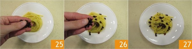 Transfer the pasta to plates, finish with the crispy guanciale 25 and the Caiazzane olive powder 26. The fake carbonara is ready to serve.