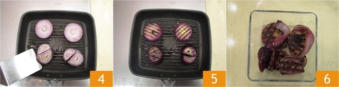 Let them grill, then turn them to the other side 4 and add another drizzle of oil. Continue to grill the onions for about 15 minutes, turning them occasionally 5. They should be soft and well-grilled. Then transfer them to a bowl and let them cool 6.